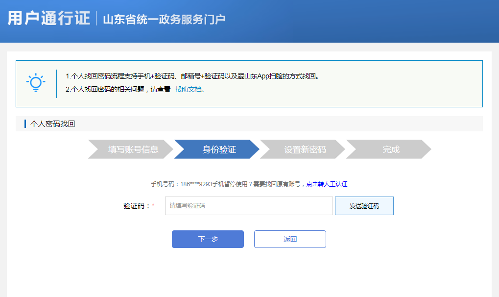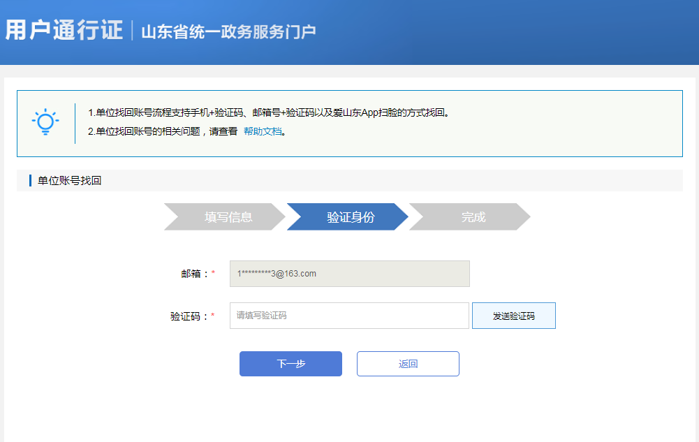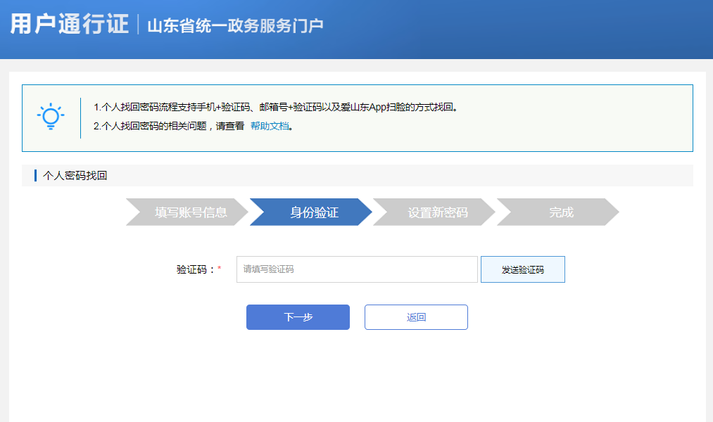 3. 在验证身份环节涉及到三种验证方式:手机号+验证码方式、邮箱+验证码方式、爱山东APP扫脸认证。