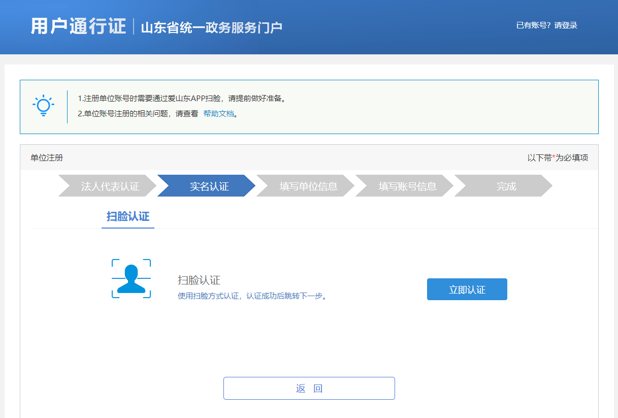 (3)通过“爱山东APP扫脸认证”进行验证,点击“立刻验证”,跳转到如下界面,打开“爱山东”APP点击首页上部的“扫一扫”功能实现扫脸验证。