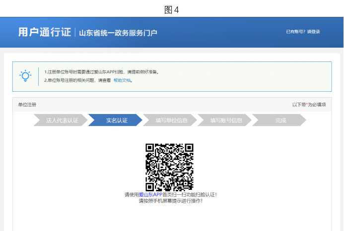 3. 在“实名认证”界面点击“立即认证”,页面出现二维码信息(图4),请使用“爱山东App”首页扫一扫功能进行刷脸认证(图5)。