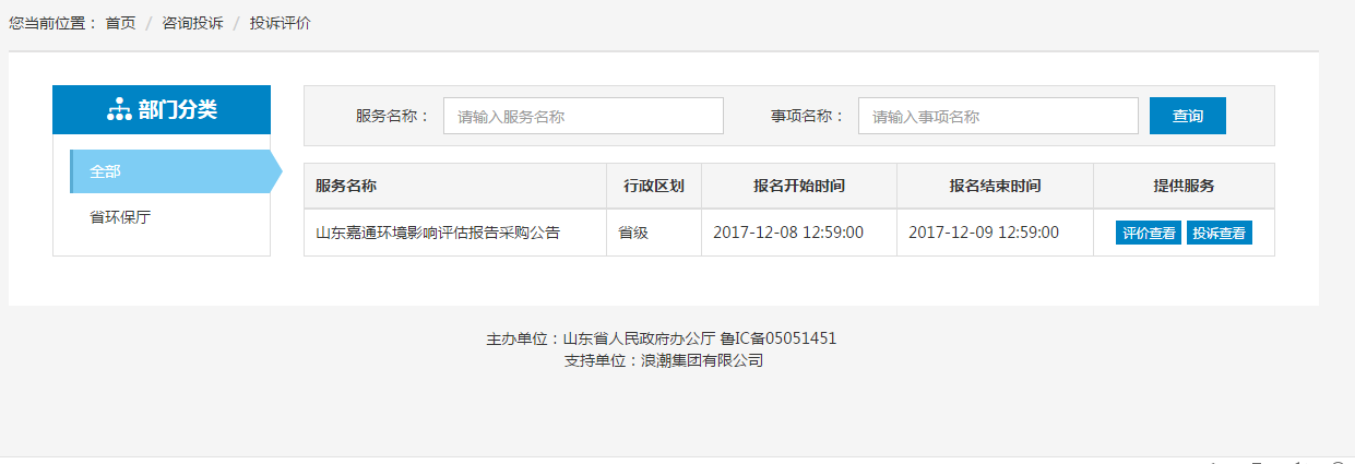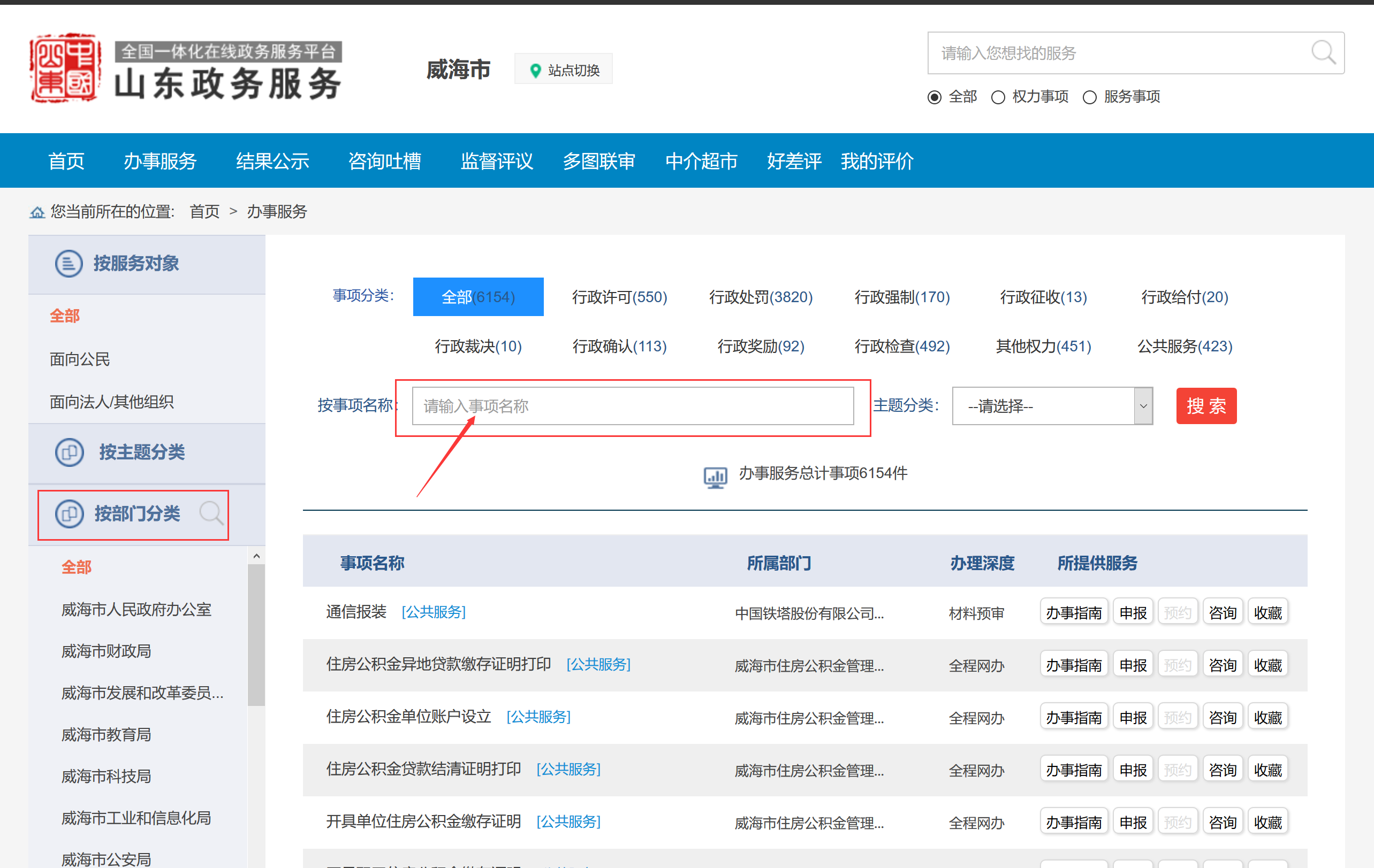 2.在“办事服务”页面根据需要办理的具体事项在左侧“按部门分类”中查找该事项所在的部门,然后在该部门下查找具体办理的事项,也可在事项名称框中直接输入事项名称进行查找。