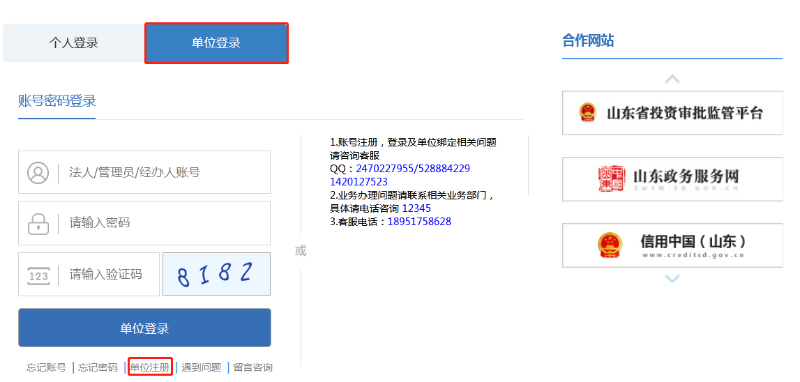 在系统首页上方点击“登录”按钮(如图1)并在山东省统一政务服务门户网站上点击单位登录输入法人账号、密码、验证码(如图2)。