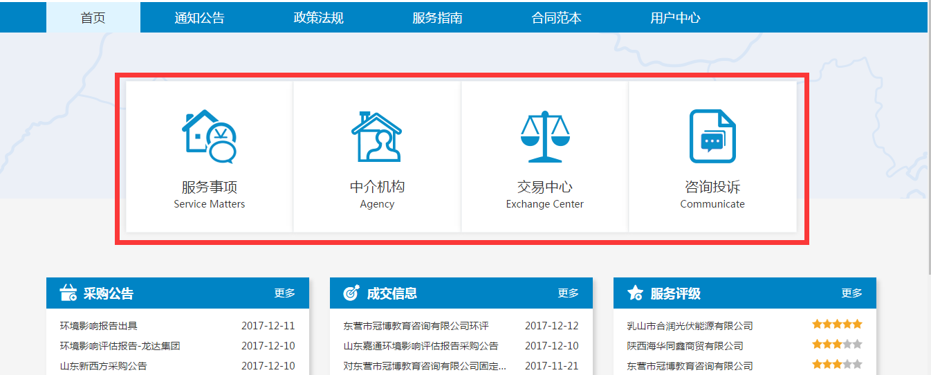 页面中央快捷入口提供“服务事项”,“中介机构”,“交易中心”,“咨询投诉”四个针对采购人和中介机构常用的功能(如图1)。