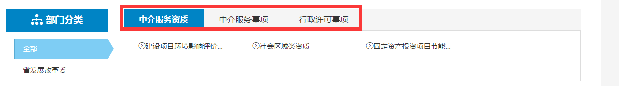 “服务事项”展示梳理的全省中介服务事项信息,根据所选的站点过滤,公众可以浏览查看相关信息(如图2),采购人可以通过“发布公告”快捷入口针对中介服务事项、行政许可事项、中介服务资质来快捷发布公告(如图3),也可通过“咨询”按钮向中介服务事项对应的中介机构和业务主管部门进行咨询(如图4),也可以通过“中介机构”快捷入口查看中介服务事项、行政许可事项、中介服务资质所对应的中介机构(如图5)。