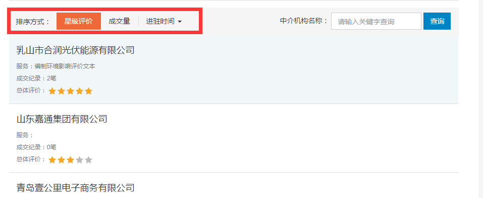 首页上“服务评级”栏目展示六个评分最高中介机构名称,点击更多,展示所有中介机构的星级排行榜,并提供星级评价、成交量、成交时间三种排序方式(如图4)。
