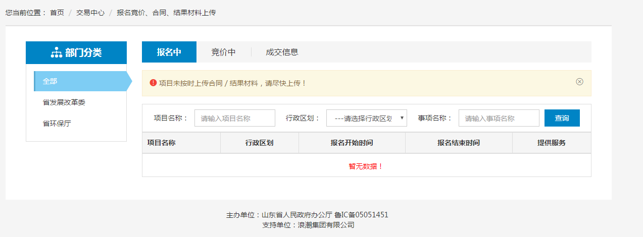 采购人和中介服务机构可以通过“提交”快捷按钮对处于报名中、竞价中以及成交信息进行查看,查询时可以通过项目名称、行政区划、事项名称进行查询(如图12)
