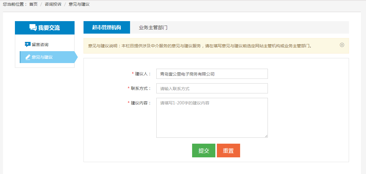 采购人、中介机构和游客可通过“意见建议”栏目对超市管理机构和行业主管部门提出意见以及建议(如图17)。