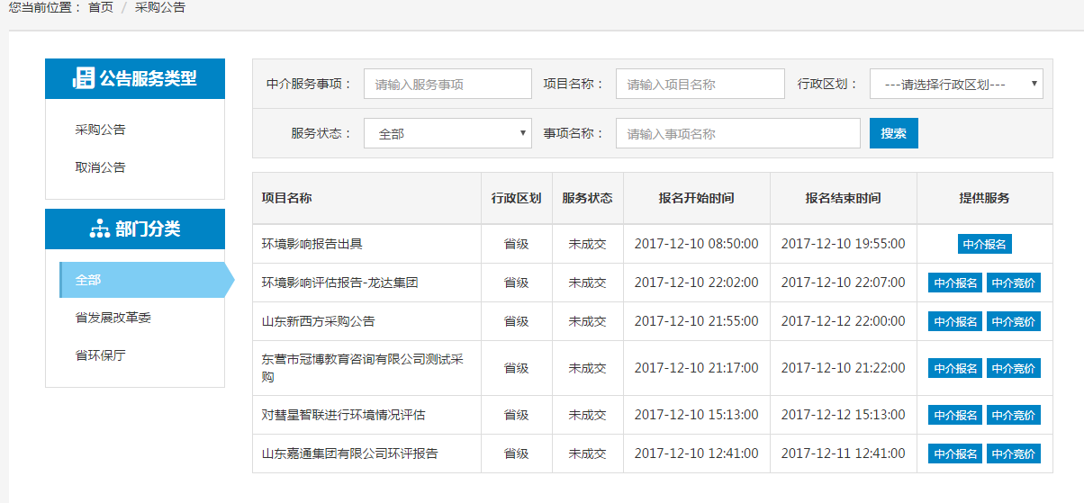首页上“采购公告”栏目展示六条最新发布的省市县采购公告。点击更多可以查看所有已发布的采购公告,提供中介服务事项、部门分类、项目名称、行政区划、服务状态、事项名称六类检索方式,并为中介机构提供“中介报名”“中介竞价”的快捷操作(如图2)。