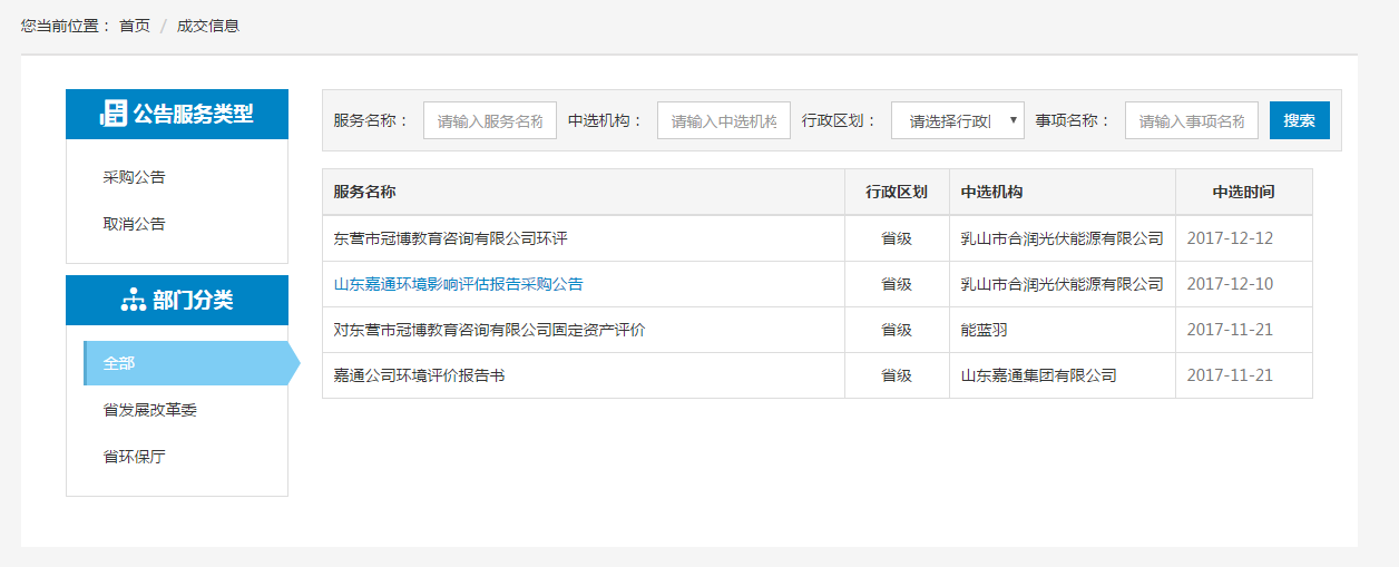首页上“成交信息”栏目展示六条最新成交的省市县项目信息。点击更多可以查看所有成交的项目,提供部门分类、服务名称、中选机构、行政区划、事项名称五类检索方式(如图3)。
