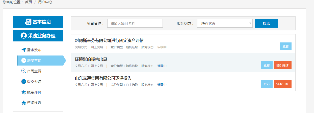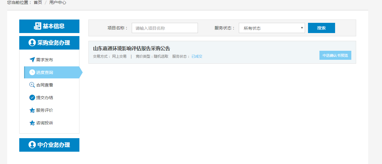 在采购人完成需求发布操作之后,点击左侧菜单“采购业务办理”图标下的“进度查询”即可查找到已经提交的需求信息及服务状态(见图1)以及中选确认书的预览(见图2)。