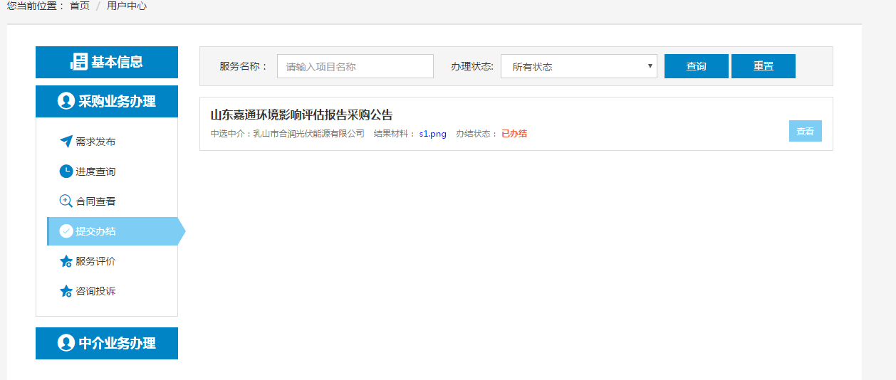 当采购人对与中介机构完成合同中所规定的内容后点击左侧菜单“采购业务办理”图标下的“提交办结”即可查看到所有合同信息,并可以对以完成的服务进行办结操作及信息查看(见图1)。