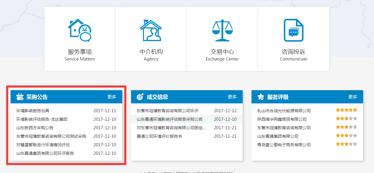 页面下方的展示部分,分为“采购公告”“成交信息”“服务评级”三类用户关注的重要信息(如图1)。