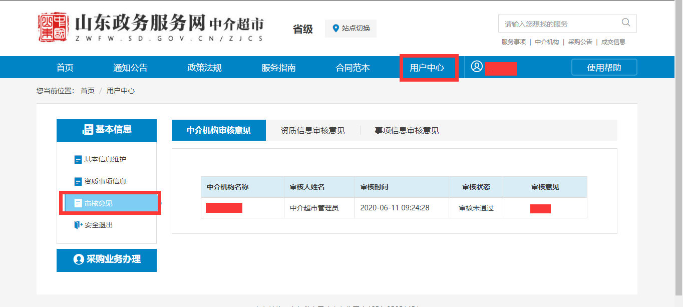 中介超市系统账号与政务服务网使用统一的用户机制,只有在政务服务网已经注册的用户才能进行中介超市系统的登录。未注册的中介机构需要前往政务服务网进行注册(http://zwfw.sd.gov.cn/)。注册、企业绑定及企业信息变更有疑问的可以在山东政务服务网上通过标题栏中‘使用帮助’找到解答,地址是:http://zwfw.sd.gov.cn/sdzw/see/cjwt/index.do?orgcode=SD37000000,账号注册,登录及单位绑定相关问题请咨询客服QQ:2639980878,客服电话:18663778981。注册成功即可前往中介超市系统(http://zwfw.sd.gov.cn/zjcs)办理中介机构进驻操作(如图1),点击菜单栏的“用户中心”,进入用户中心页面,点击页面左侧的“基本信息”标签下的“基本信息维护”完善基本信息,再点击“中介机构入驻”按钮,进行中介机构的进驻操作。用户在“中介机构入驻”中填写完成提交之后,将不会显示“中介机构入驻”按钮,在“基本信息”标签下的“基本信息维护”下会出现“中介扩展信息”(如图2),可以从此处查看和修改入驻信息。用户可以通过“基本信息”标签下的“审核意见”(如图3)查看中介机构入驻是否审核。